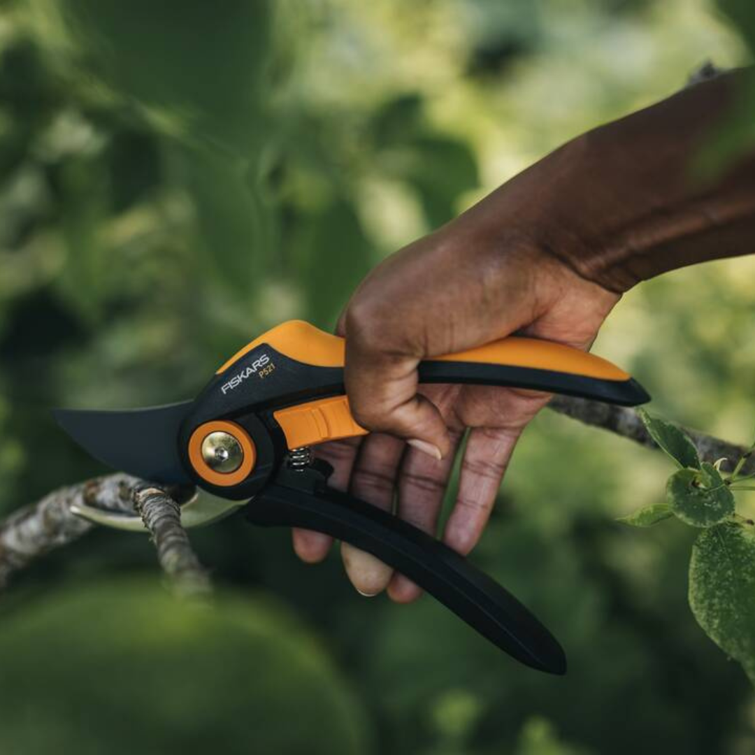 The Fiskars® Plus™ Bypass Pruner (P521) is an ergonomic, lightweight tool for easy cuts through stems and branches. A fully hardened, precision-ground blade stays sharp longer, while a low-friction blade coating resists rust and allows for smoother, easier cuts.